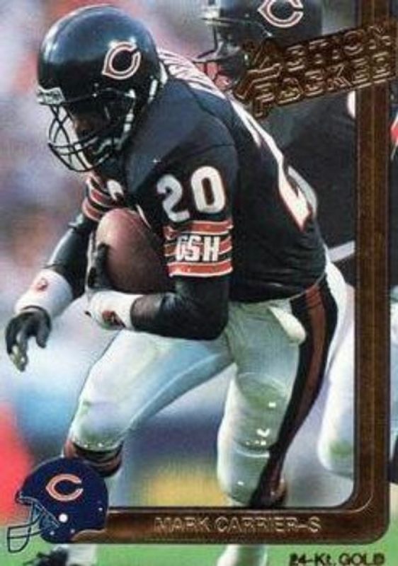 The Mark Carrier 1991 Action Packed #7G 24K Gold card is 1 of 3 Mark Carrier's card variations in the 1991 Action Packed set being tracked by Sports Card Investor, including #24 Base, and #262 Base.