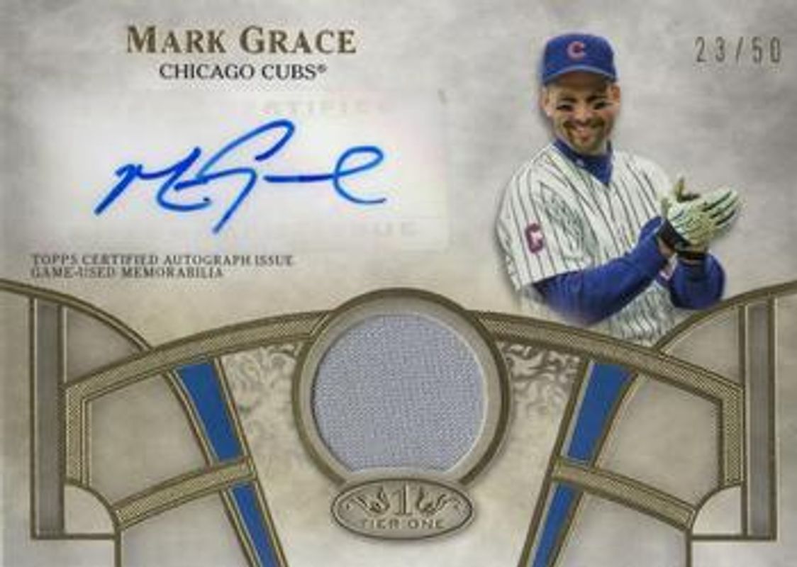 The Mark Grace 2021 Topps Tier One #T1AR-MG Autographs Relics /30 card is 1 of 3 Mark Grace's card variations in the 2021 Topps Tier One set being tracked by Sports Card Investor, including Autographs Relics Dual Patch /10, and Autographs Relics Triple Patch /1.