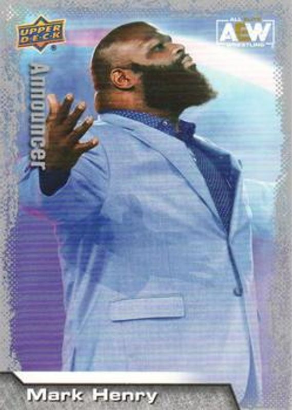 The Mark Henry 2022 Upper Deck AEW #99 Base card is 1 of 41 Mark Henry's card variations in the 2022 Upper Deck AEW set being tracked by Sports Card Investor, including Gold, Pyro, Silver Foil, Green Pyro /399, and Dynamite /299.
