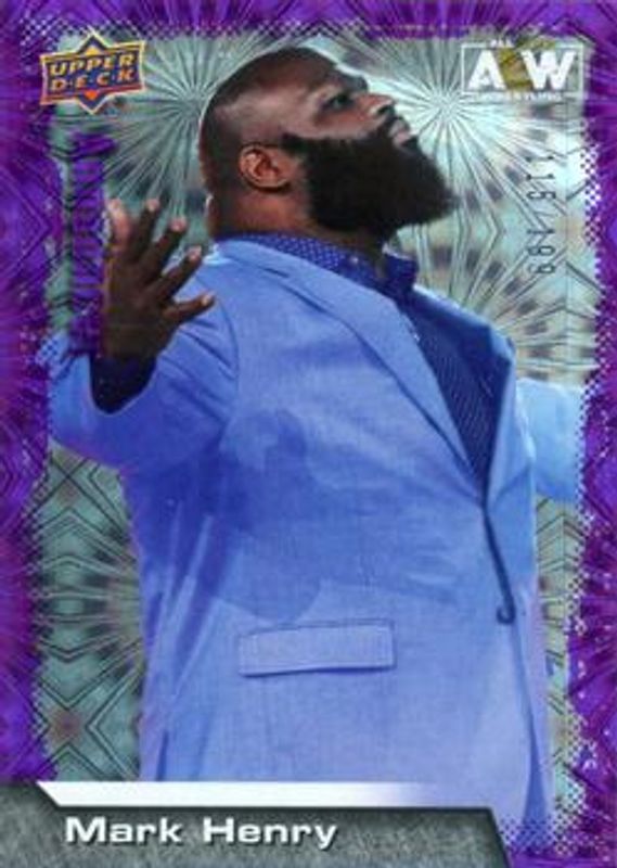 The Mark Henry 2022 Upper Deck AEW #99 Purple Pyro /199 card is 1 of 41 Mark Henry's card variations in the 2022 Upper Deck AEW set being tracked by Sports Card Investor, including Base, Gold, Pyro, Silver Foil, and Green Pyro /399.