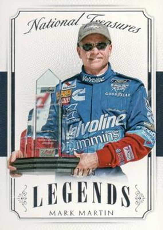 The Mark Martin 2016 National Treasures NASCAR #38 Base /25 card is 1 of 57 Mark Martin's card variations in the 2016 National Treasures NASCAR set being tracked by Sports Card Investor, including Century Silver /20, Century Gold /15, Century Black /5, Century Blue /1, and Printing Plates Black /1.