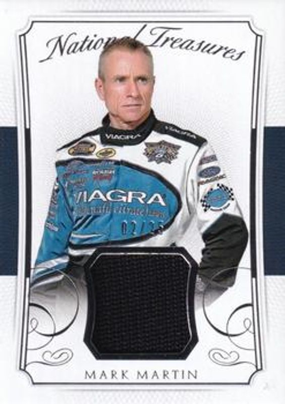 The Mark Martin 2016 National Treasures NASCAR #FM-MM Firesuit Materials /25 card is 1 of 57 Mark Martin's card variations in the 2016 National Treasures NASCAR set being tracked by Sports Card Investor, including Base /25, Century Silver /20, Century Gold /15, Century Black /5, and Century Blue /1.