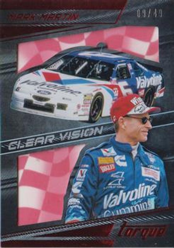 The Mark Martin 2017 Torque NASCAR #6 Clear Vision Red /49 card is 1 of 34 Mark Martin's card variations in the 2017 Torque NASCAR set being tracked by Sports Card Investor, including Base, Gold, Blue /150, Red /100, and Artist Proof /75.