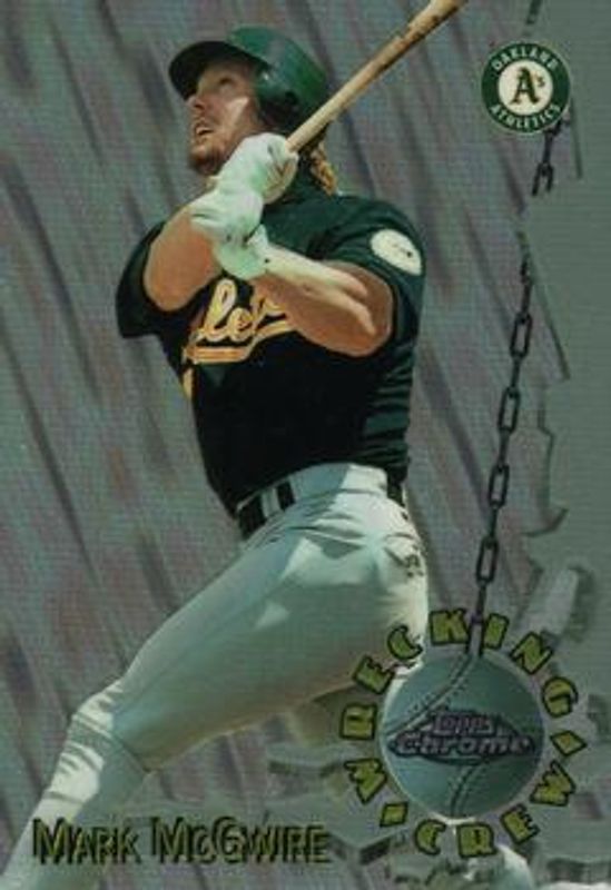 The Mark McGwire 1996 Topps Chrome #WC11 Wrecking Crew card is 1 of 4 Mark McGwire's card variations in the 1996 Topps Chrome set being tracked by Sports Card Investor, including Base, Refractor, and Wrecking Crew - Refractor.