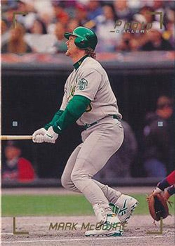 The Mark McGwire 1997 Topps Gallery #PG8 Photo Gallery card is 1 of 6 Mark McGwire's card variations in the 1997 Topps Gallery set being tracked by Sports Card Investor, including Base, Players Private Issue, Gallery of Heroes, Peter Max, and Peter Max - Signature Series Serigraphs.