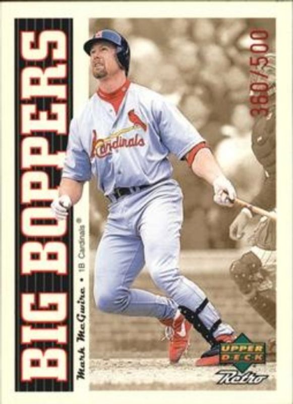 The Mark McGwire 1998 Upper Deck Retro #B29 Big Boppers /500 card is 1 of 6 Mark McGwire's card variations in the 1998 Upper Deck Retro set being tracked by Sports Card Investor, including Base, Groovy Kind of Glove, Lunchboxes, Time Capsule, and Quantum Leap /50.