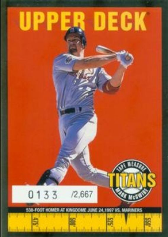 The Mark McGwire 1998 Upper Deck #1 Tape Measure Titans Gold /2667 card is 1 of 25 Mark McGwire's card variations in the 1998 Upper Deck set being tracked by Sports Card Investor, including #610 Base, #9 Base, #150 Base, #205 Base, and #454 Base.