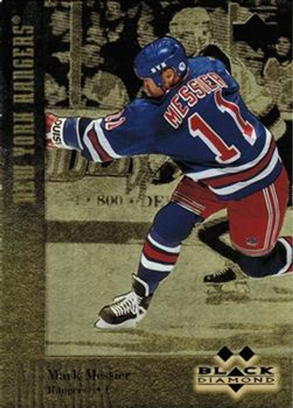 The Mark Messier 1996 Upper Deck Black Diamond #100 Gold card is 1 of 3 Mark Messier's card variations in the 1996 Upper Deck Black Diamond set being tracked by Sports Card Investor, including Base, and Run for the Cup /100.