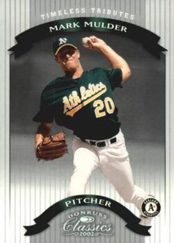 The Mark Mulder 2002 Donruss Classics #92 Timeless Tributes /100 card is 1 of 7 Mark Mulder's card variations in the 2002 Donruss Classics set being tracked by Sports Card Investor, including Base /1500, Samples - Gold, Samples - Silver, Chicago National /5, and New Millennium Classics /500.