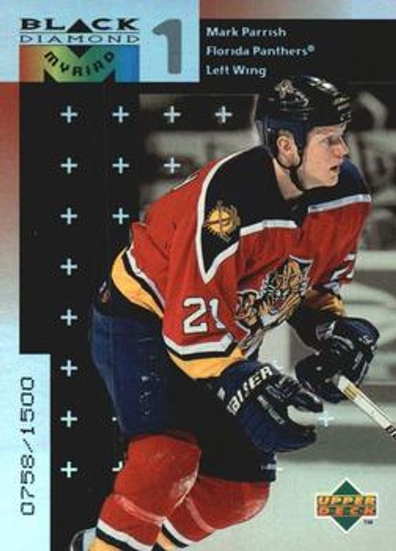 The Mark Parrish 1998 Upper Deck Black Diamond #M20 Myriad /1500 Rookie card is 1 of 6 Mark Parrish's card variations in the 1998 Upper Deck Black Diamond set being tracked by Sports Card Investor, including Base, Double Diamond /2000, Triple Diamond /1000, Quadruple Diamond /100, and Myriad 2 /1.