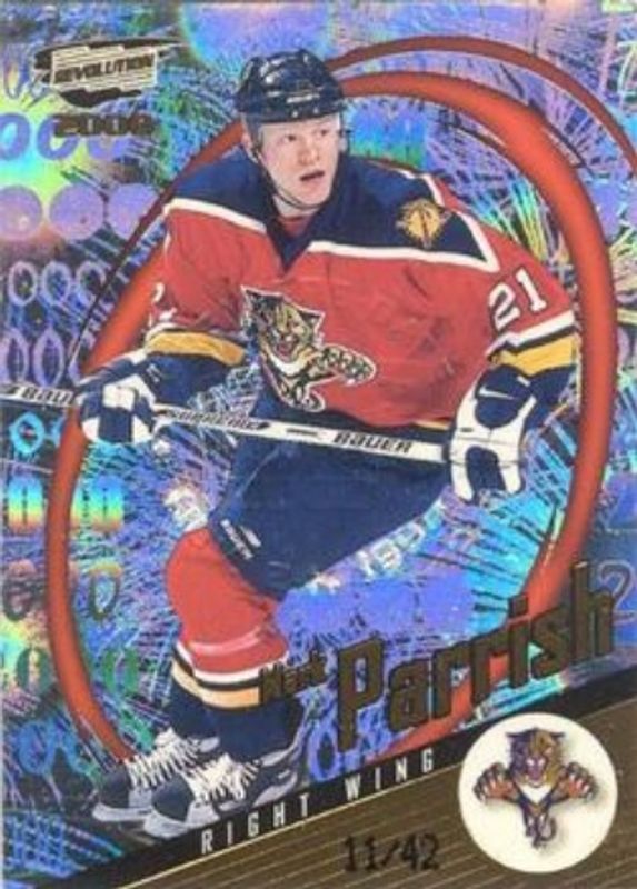 The Mark Parrish 1999 Pacific Revolution #65 Premiere Date /42 card is 1 of 8 Mark Parrish's card variations in the 1999 Pacific Revolution set being tracked by Sports Card Investor, including Base, Red /299, Shadow Series /99, Showstoppers, and CSC Silver /25.
