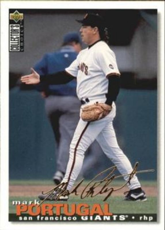 The Mark Portugal 1995 Upper Deck Collector's Choice #258 Gold Signatures card is 1 of 3 Mark Portugal's card variations in the 1995 Upper Deck Collector's Choice set being tracked by Sports Card Investor, including Base, and Silver Signatures.