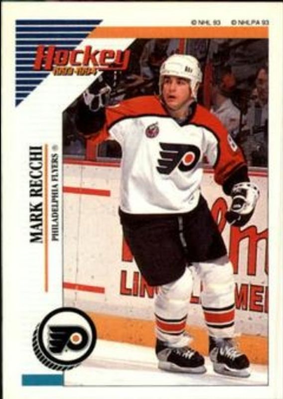 The Mark Recchi 1993 Panini Stickers #46 Base card is 1 of 2 Mark Recchi's card variations in the 1993 Panini Stickers set being tracked by Sports Card Investor, including Base.