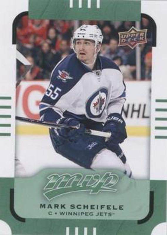 The Mark Scheifele 2015 Upper Deck MVP #33 Green (e Pack) card is 1 of 10 Mark Scheifele's card variations in the 2015 Upper Deck MVP set being tracked by Sports Card Investor, including Base, Colours & Contours, Silver Script, Gold Script /100, and Super Script /25.