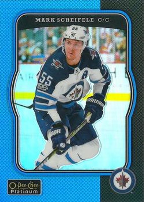 The Mark Scheifele 2017 O-Pee-Chee Platinum #R-43 Retro Blue Rainbow /149 card is 1 of 20 Mark Scheifele's card variations in the 2017 O-Pee-Chee Platinum set being tracked by Sports Card Investor, including Base, Rainbow, Violet Pixels, Red Prism /199, and Royal Blue Cubes /99.