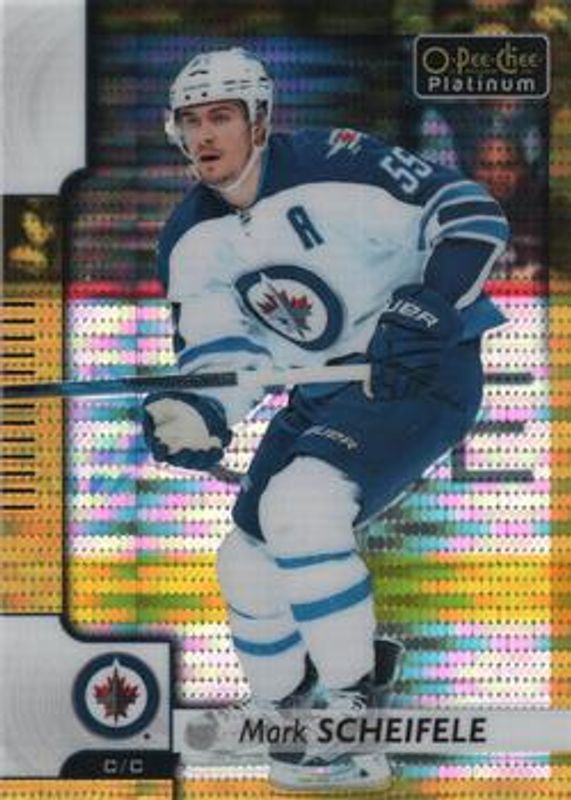 The Mark Scheifele 2017 O-Pee-Chee Platinum #54 Seismic Gold /50 card is 1 of 20 Mark Scheifele's card variations in the 2017 O-Pee-Chee Platinum set being tracked by Sports Card Investor, including Base, Rainbow, Violet Pixels, Red Prism /199, and Royal Blue Cubes /99.