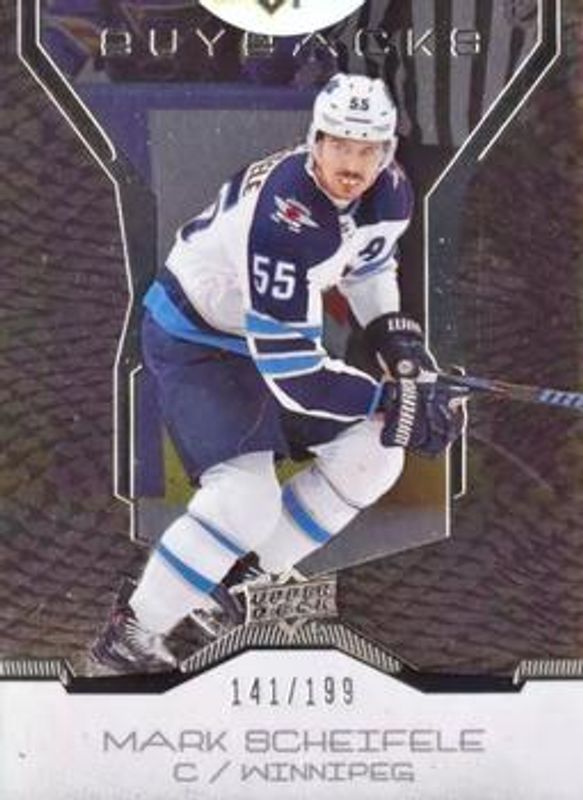 The Mark Scheifele 2019 Upper Deck Buybacks #26 Base /199 card is 1 of 11 Mark Scheifele's card variations in the 2019 Upper Deck Buybacks set being tracked by Sports Card Investor, including #26 Gold /50, #26 Emerald /25, #26 Purple /1, #54 Autographed Buybacks /2, and #63 Autographed Buybacks /2.