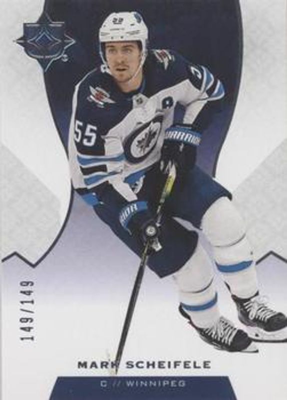 The Mark Scheifele 2019 Upper Deck Ultimate Collection #12 Base /299 card is 1 of 21 Mark Scheifele's card variations in the 2019 Upper Deck Ultimate Collection set being tracked by Sports Card Investor, including Autographs, Onyx Black /10, Autographed Shields /1, Autographs Onyx Black /1, and Ultimate Access Jersey.