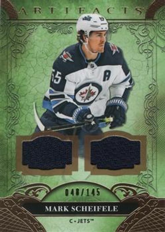 The Mark Scheifele 2020 Upper Deck Artifacts #137 Material - Gold /145 card is 1 of 21 Mark Scheifele's card variations in the 2020 Upper Deck Artifacts set being tracked by Sports Card Investor, including Base /999, Ruby /399, Copper /299, Emerald /99, and Autumn /75.