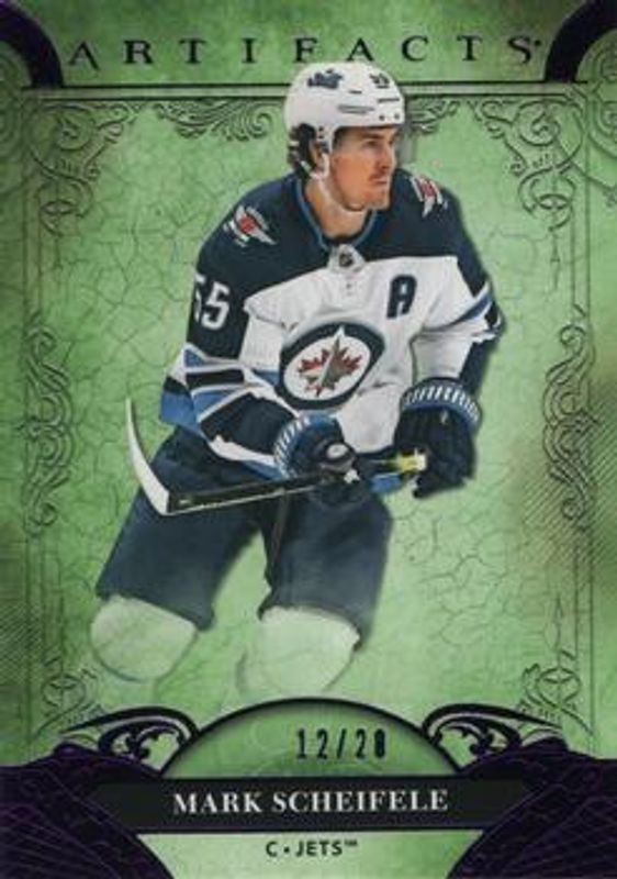 The Mark Scheifele 2020 Upper Deck Artifacts #137 Purple /20 card is 1 of 21 Mark Scheifele's card variations in the 2020 Upper Deck Artifacts set being tracked by Sports Card Investor, including Base /999, Ruby /399, Copper /299, Emerald /99, and Autumn /75.