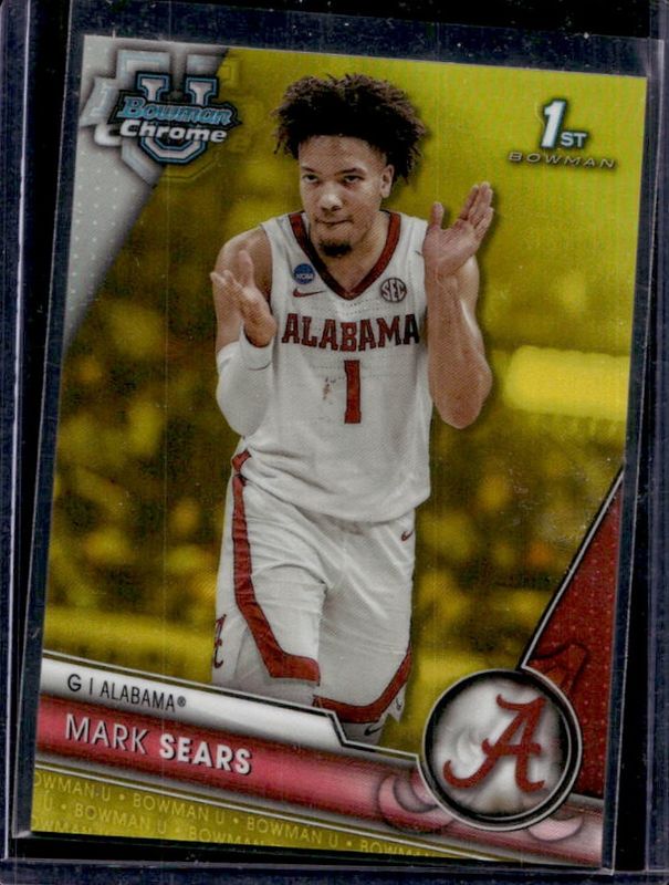 The Mark Sears 2023 Bowman Chrome University #72 Yellow Refractor /75 card is 1 of 38 Mark Sears' card variations in the 2023 Bowman Chrome University set being tracked by Sports Card Investor, including Base, Pink Refractor, Purple Shimmer Refractor, Refractor, and X-Fractor.