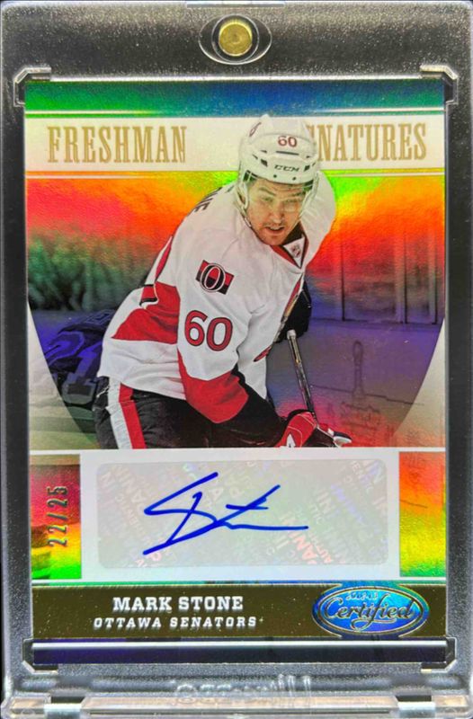 The Mark Stone 2012 Certified #155 Mirror Gold /25 Rookie card is 1 of 7 Mark Stone's card variations in the 2012 Certified set being tracked by Sports Card Investor, including Base /999, Mirror Red /100, Mirror Hot Box /75, Mirror Blue /50, and Mirror Emerald /5.