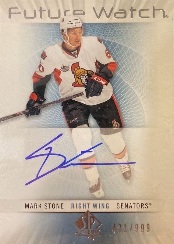 The Mark Stone 2012 SP Authentic #229 Future Watch Auto /999 Rookie card in Raw condition has moved up $3.66 (+9.1%) in the last 30 days and was last sold for $43.66 .