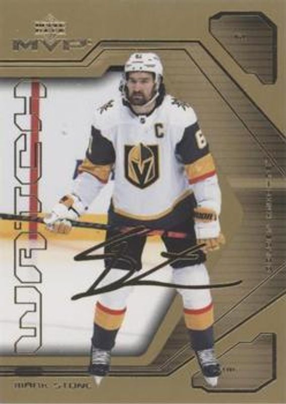 The Mark Stone 2021 Upper Deck MVP #26 20th Anniversary - Gold card is 1 of 34 Mark Stone's card variations in the 2021 Upper Deck MVP set being tracked by Sports Card Investor, including Base, Blue, Gold Script, Ice Battles, and Silver Script.