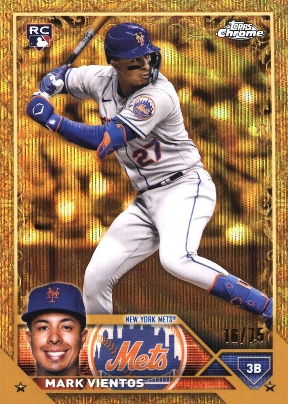This card is 1 of 12 Mark Vientos' card variations in the 2023 Topps Gilded Collection set being tracked by Sports Card Investor, including Base /99, Mini-Diamond Gold Etch Refractor /50, RayWave Gold Etch Refractor /25, Lava Gold Etch Refractor /10, and Superfractor /1.