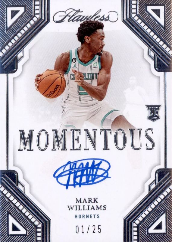 The Mark Williams 2022 Flawless #MA-MKW Momentous Autographs /25 Rookie card in Raw condition has not changed in price in the last 30 days and was last sold for $54.00 .