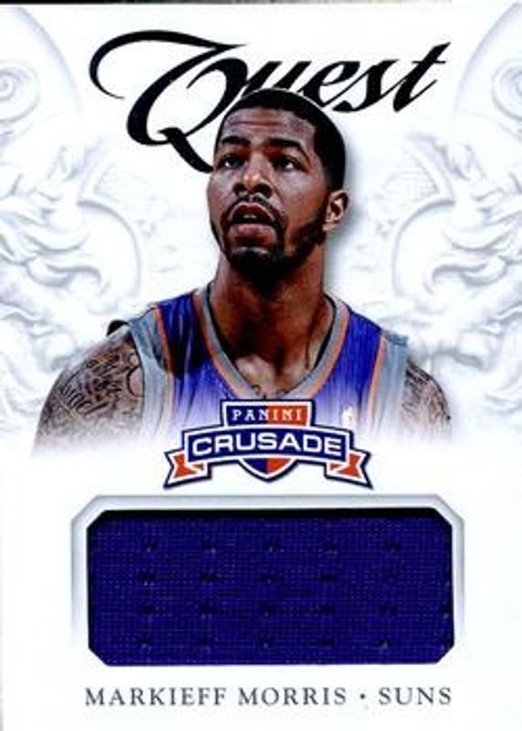The Markieff Morris 2012 Crusade #55 Quest Memorabilia Rookie card is 1 of 8 Markieff Morris' card variations in the 2012 Crusade set being tracked by Sports Card Investor, including Prizm Blue & Gold, Prizm Red & Gold /99, Prizm Purple & Gold /49, Prizm Green & Gold /25, and Prizm Gold /10.
