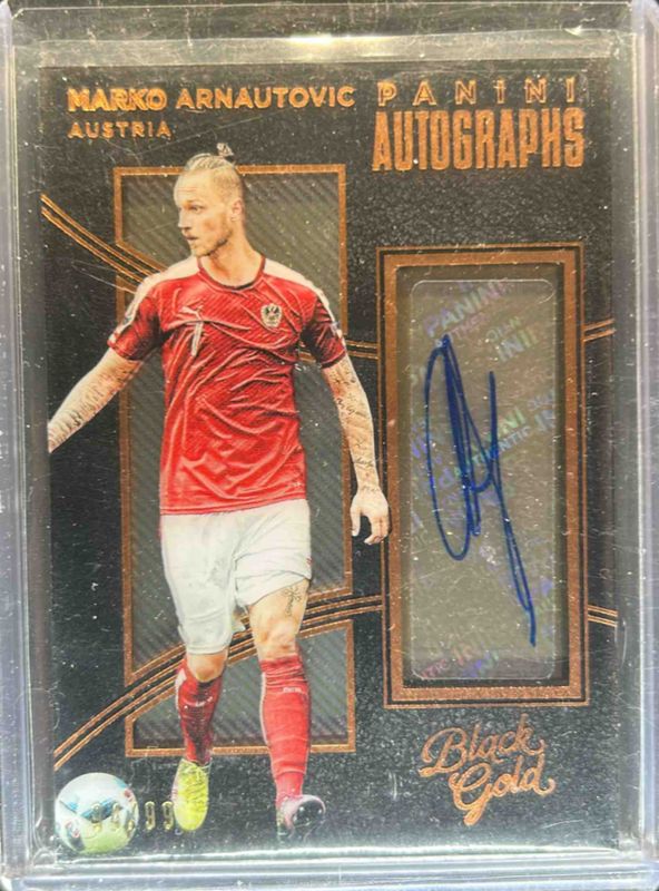 The Marko Arnautovic 2016 Black Gold #A-MAR Autographs - Bronze /99 card is 1 of 7 Marko Arnautovic's card variations in the 2016 Black Gold set being tracked by Sports Card Investor, including Autographs, Gilded Signatures /199, Autographs Holo - Gold /25, Gilded Signatures Holo - Gold /25, and Autographs - Black Gold /1.
