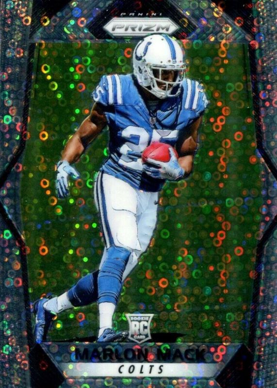 This card is 1 of 19 Marlon Mack's card variations in the 2017 Prizm set being tracked by Sports Card Investor, including Green, Pink, Red White Blue, Silver, and Orange /275.