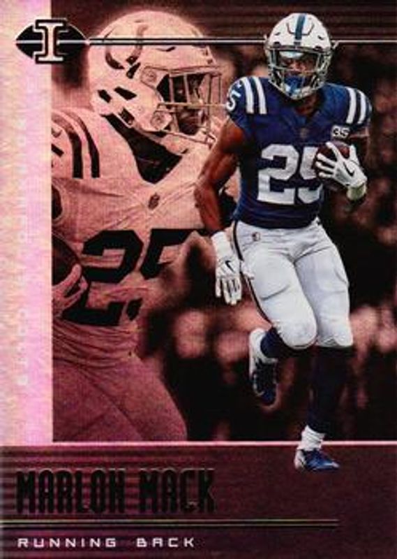 The Marlon Mack 2019 Illusions #14 Base card is 1 of 19 Marlon Mack's card variations in the 2019 Illusions set being tracked by Sports Card Investor, including Retail, Trophy Collection Emerald, Trophy Collection Orange, Trophy Collection Sapphire, and Trophy Collection Gold /399.