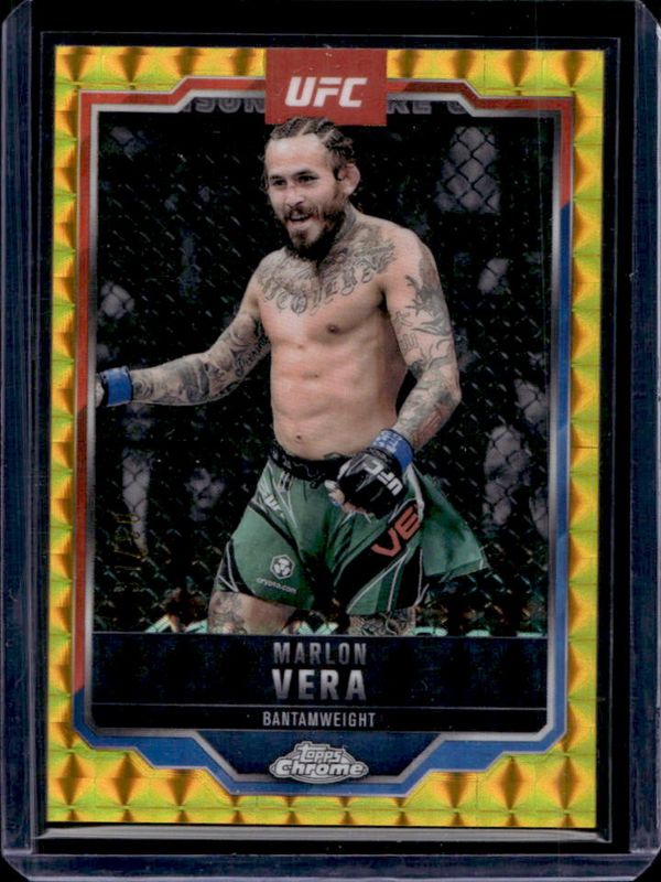 The Marlon Vera 2025 Topps Chrome UFC #151 Gold Geometric Refractor /50 card is 1 of 50 Marlon Vera's card variations in the 2025 Topps Chrome UFC set being tracked by Sports Card Investor, including Base, Geometric Refractor, Negative Refractor, Prism Refractor, and Purple Refractor.