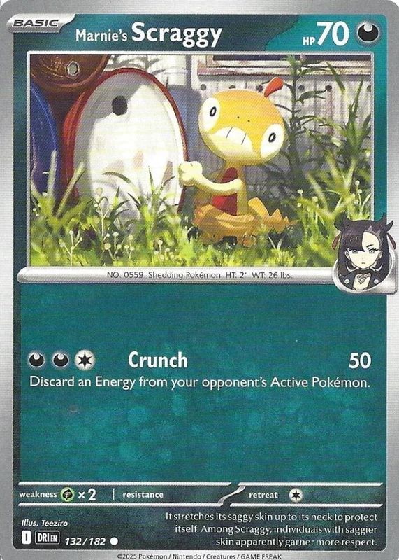 This card is 1 of 2 Marnie's Scraggy's card variations in the 2025 Scarlet & Violet: Destined Rivals set being tracked by Sports Card Investor, including Reverse Holo.