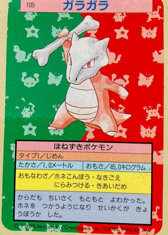This card is 1 of 2 Marowak's card variations in the 1997 Japanese Topsun set being tracked by Sports Card Investor, including Green Back (2nd Edition).