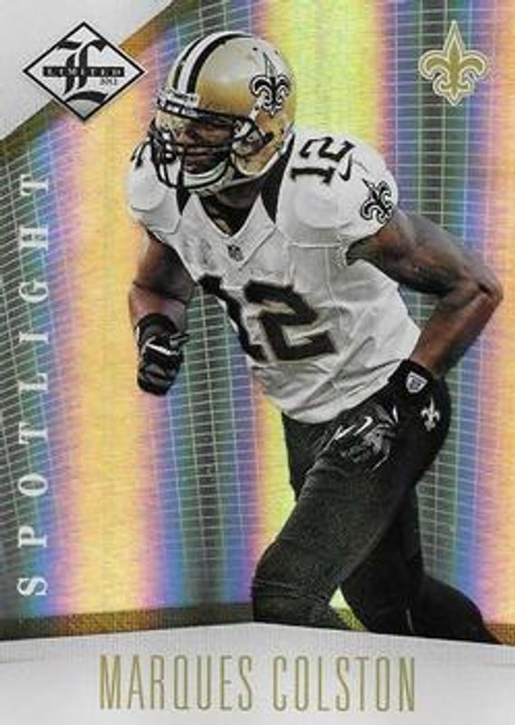 The Marques Colston 2012 Limited #61 Gold Spotlight /25 card is 1 of 17 Marques Colston's card variations in the 2012 Limited set being tracked by Sports Card Investor, including Base /199, Silver Spotlight /49, Platinum Spotlight /1, Threads Prime Black Box 2013 /1, and Threads /99.