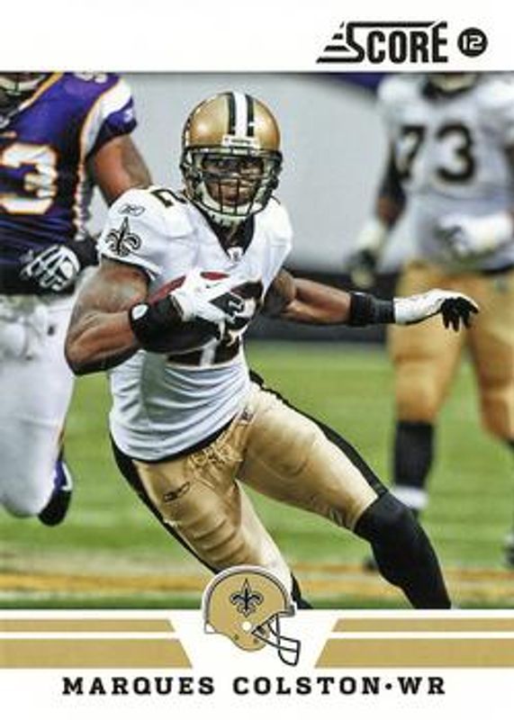 The Marques Colston 2012 Score #27 Glossy card is 1 of 10 Marques Colston's card variations in the 2012 Score set being tracked by Sports Card Investor, including Gold Zone, Scorecard, Artist's Proof /32, Red Zone /20, and End Zone /6.