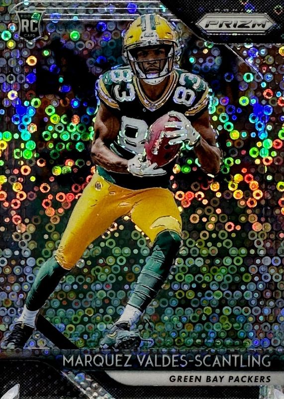 This card is 1 of 22 Marquez Valdes-Scantling's card variations in the 2018 Prizm set being tracked by Sports Card Investor, including Base, Green, Lazer, Neon Green Pulsar, and Red White Blue.