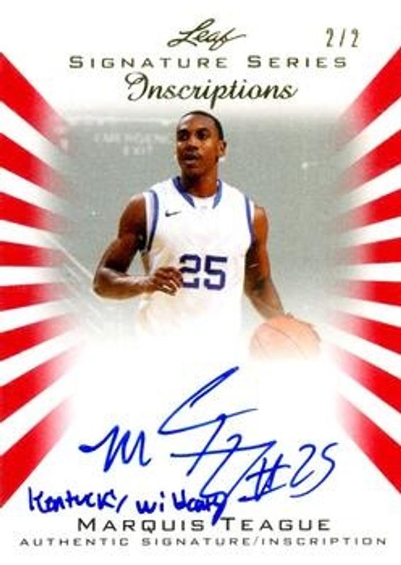 The Marquis Teague 2012 Leaf Signature Series #IA-MT1 Inscriptions - Red /2 Rookie card is 1 of 37 Marquis Teague's card variations in the 2012 Leaf Signature Series set being tracked by Sports Card Investor, including Base, Silver /99, Gold /25, Blue /10, and Red /5.