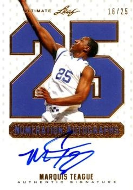 The Marquis Teague 2012 Leaf Ultimate Draft #NU-MT1 Numeration /20 Rookie card is 1 of 25 Marquis Teague's card variations in the 2012 Leaf Ultimate Draft set being tracked by Sports Card Investor, including Base, Printing Plates Black, Printing Plates Cyan, Printing Plates Magenta, and Printing Plates Yellow.