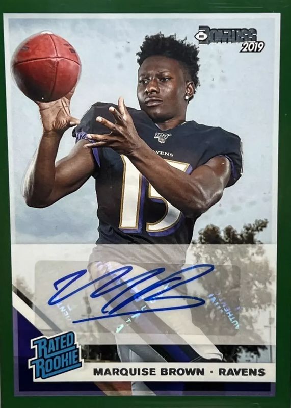 The Marquise Brown 2019 Donruss #312 Rated Rookie Autographs - Green card in Raw condition has not changed in price in the last 30 days and was last sold for $25.00 .