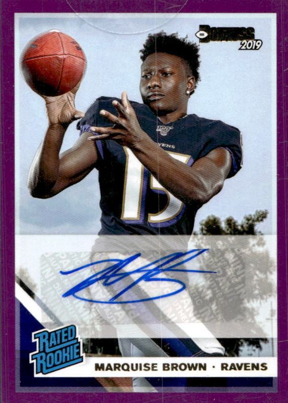 The Marquise Brown 2019 Donruss #312 Rated Rookie Autographs - Purple card in Raw condition has not changed in price in the last 30 days and was last sold for $20.00 .