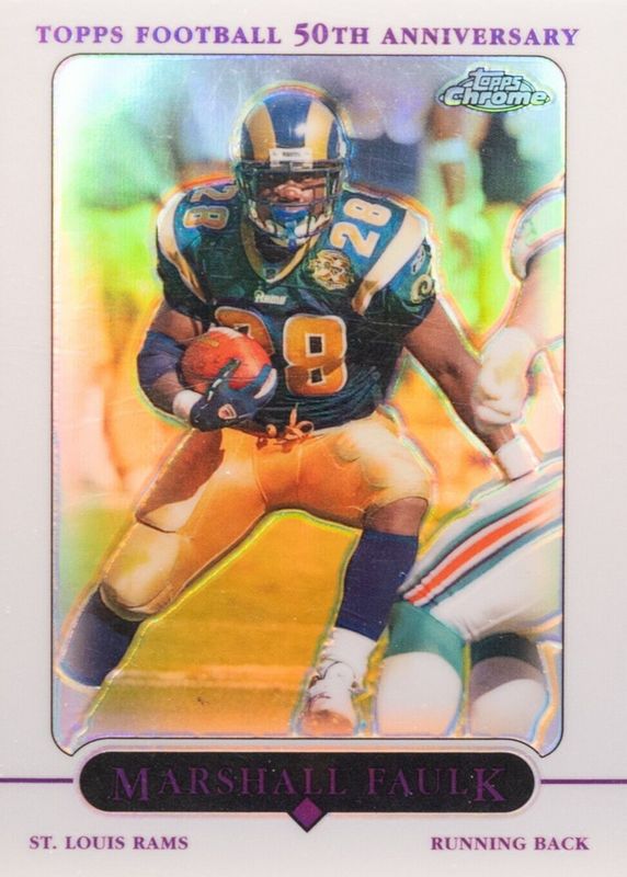 This card is 1 of 3 Marshall Faulk's card variations in the 2005 Topps Chrome set being tracked by Sports Card Investor, including Gold X-Fractor /399, and Black Refractor /100.