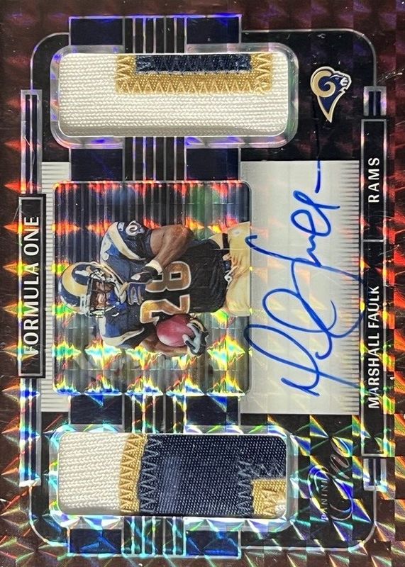 This card is 1 of 7 Marshall Faulk's card variations in the 2021 One set being tracked by Sports Card Investor, including Formula One Autographs (/10), Formula One Autographs - Blue (/6), Formula One Autographs - Gold (/3), Formula One Autographs - Platinum (/2), and Formula One Autographs - Red (/4).