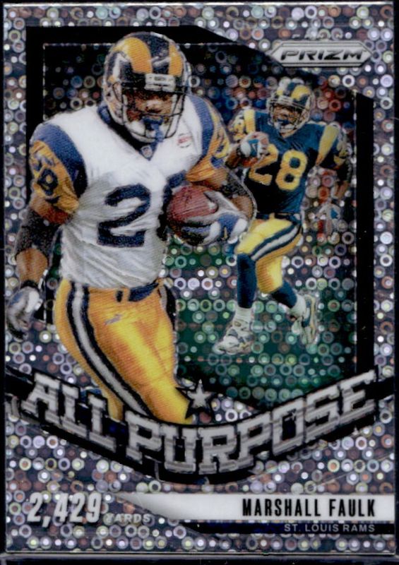 The Marshall Faulk 2024 Prizm #5 All Purpose - No Huddle card is 1 of 90 Marshall Faulk's card variations in the 2024 Prizm set being tracked by Sports Card Investor, including Base, Choice Blue Yellow Green, Choice Silver, Disco, and Green.