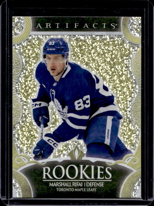 The Marshall Rifai 2024 Upper Deck Artifacts #189 Foilboard Gold Rookie card is 1 of 27 Marshall Rifai's card variations in the 2024 Upper Deck Artifacts set being tracked by Sports Card Investor, including Clear Cut, Foilboard, Neon Green, Plexi, and Silver /699.
