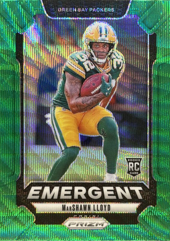 The MarShawn Lloyd 2024 Prizm #18 Emergent - Green Wave Rookie card is 1 of 113 MarShawn Lloyd's card variations in the 2024 Prizm set being tracked by Sports Card Investor, including Base, Choice Blue Yellow Green, Choice Silver, Disco, and Green.