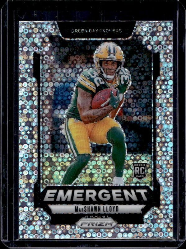 The MarShawn Lloyd 2024 Prizm #18 Emergent - No Huddle Rookie card is 1 of 113 MarShawn Lloyd's card variations in the 2024 Prizm set being tracked by Sports Card Investor, including Base, Choice Blue Yellow Green, Choice Silver, Disco, and Green.